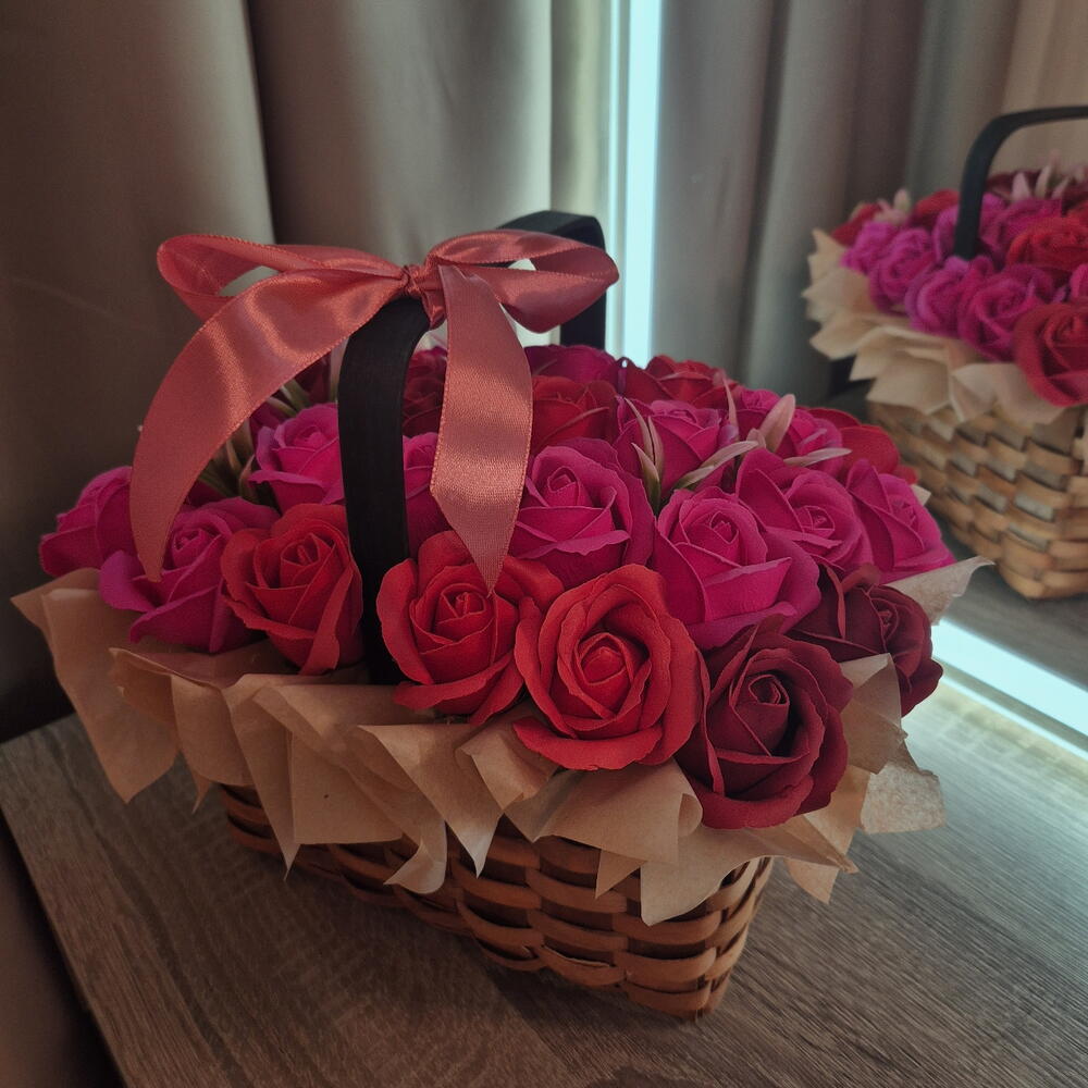 Корзинка 31 роза из мыльной пены. Сочетание красного и розового оттенков. Не требует полива, обладает приятным ароматом, долговечный декор Хороший подарок для девушки любого возраста