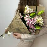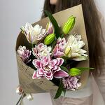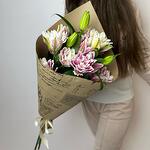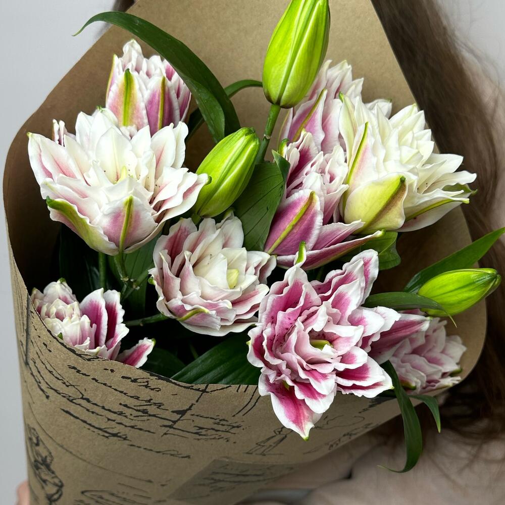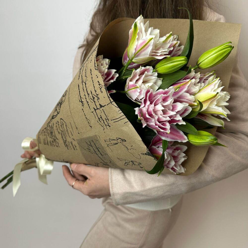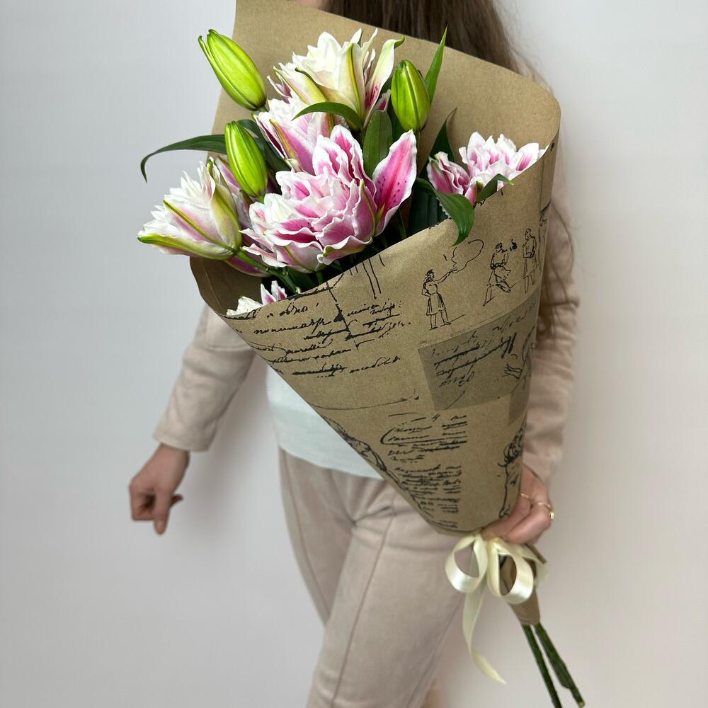 Стрічка атласна - 1 шт. Крафт упаковка - 1 шт. Лілія піоновидна - 3 шт.