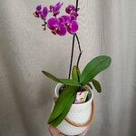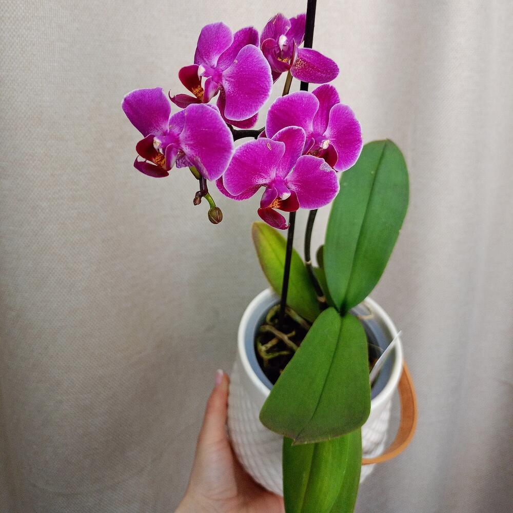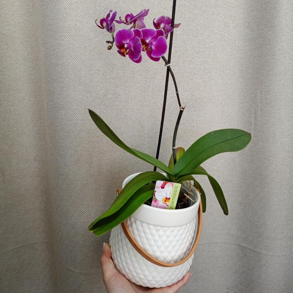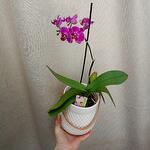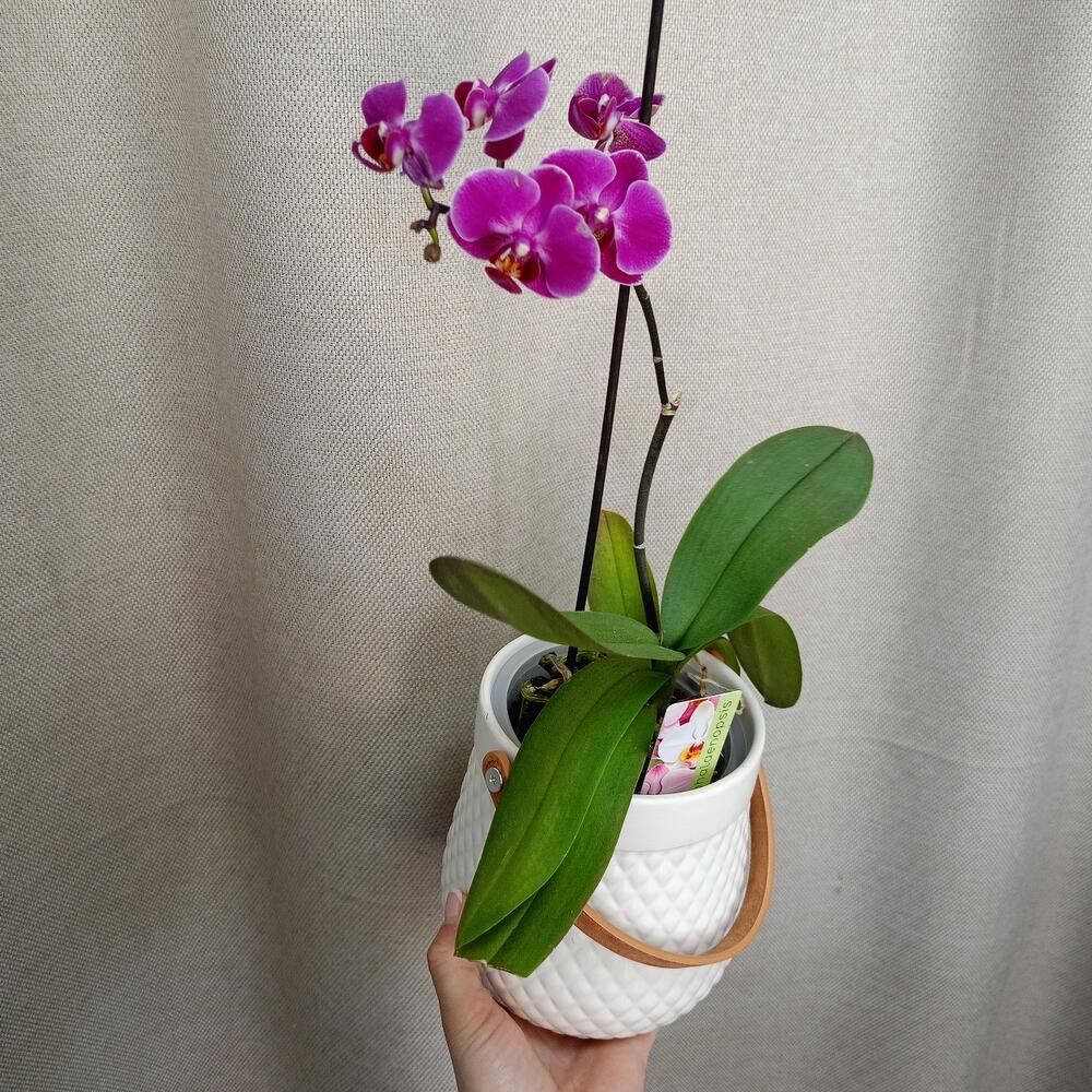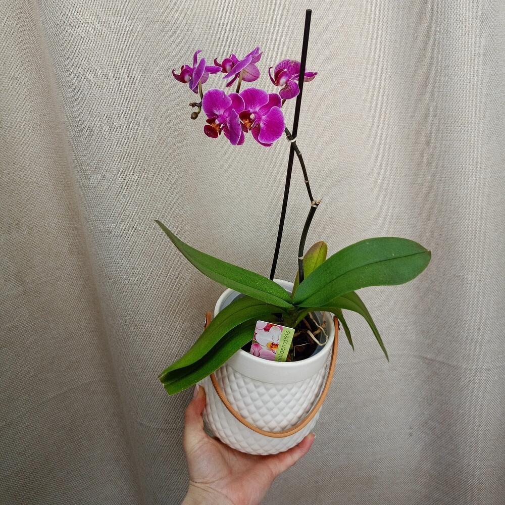 Орхидея фаленопсис, это не прихотливое и долго цветущее растение. Форма бутона, напоминает бабочку. Не имеет запаха. Может расти на солнце и в тени. Круглогодично зелёная листва. Прекрасная замена для букета, т. к цветок доставляется в декоративном кашпо. По запросу завяжем ленту.