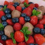 Satin ribbon - 2 pcs Клубника в шоколаде callebaut (бельгия) - 11 pcs Дизайнерская упаковка - 1 pcs свежая клубника - 17 pcs защитная пленка - 1 pcs свежая малина - 120 g свежая голубика крупная - 100 g мята пучок для декора - 1 pcs