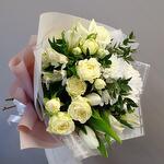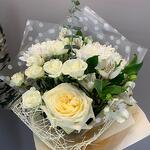 Eucalyptus - 1 pcs Rose - 1 pcs Хризантема кустовая балтика белая - 1 pcs Корейская упаковка - 1 pcs роза кустовая пиано видное - 1 pcs альстромериямикс белая - 2 pcs
