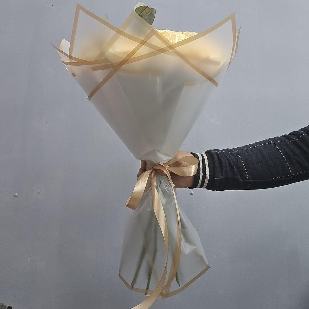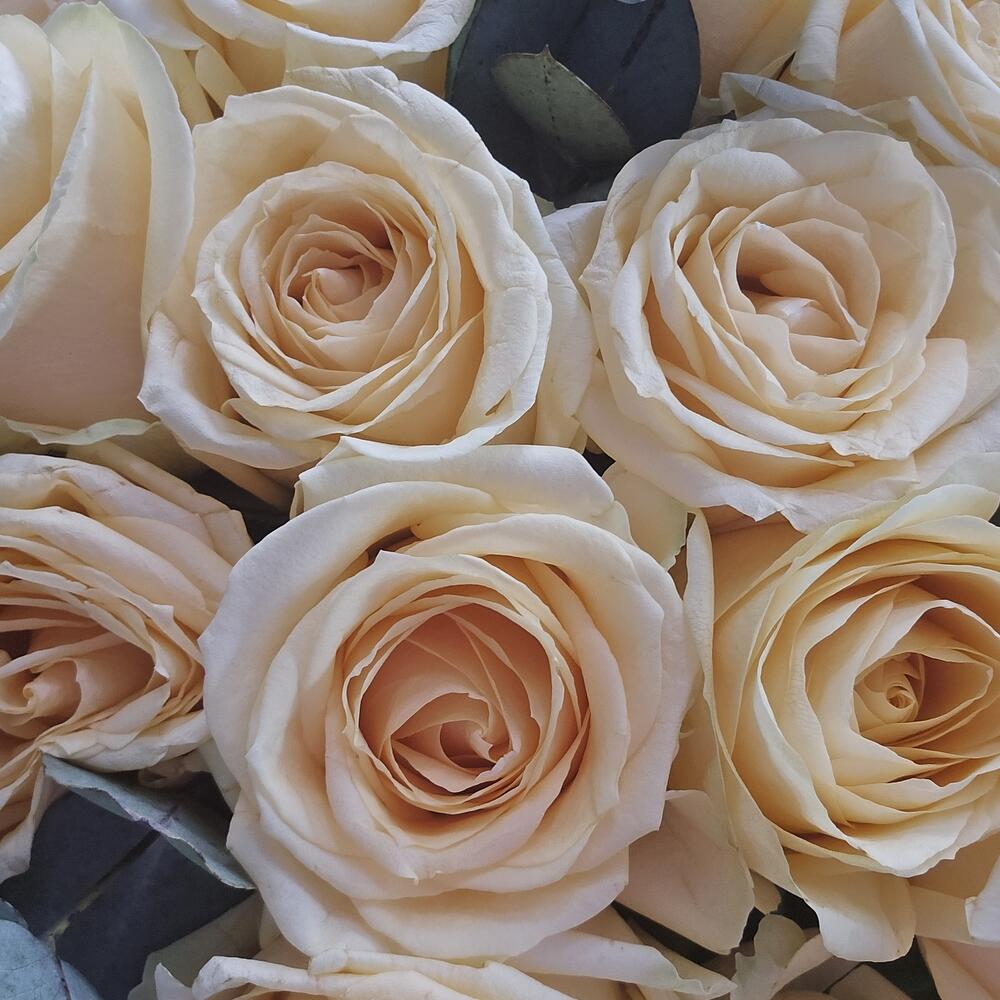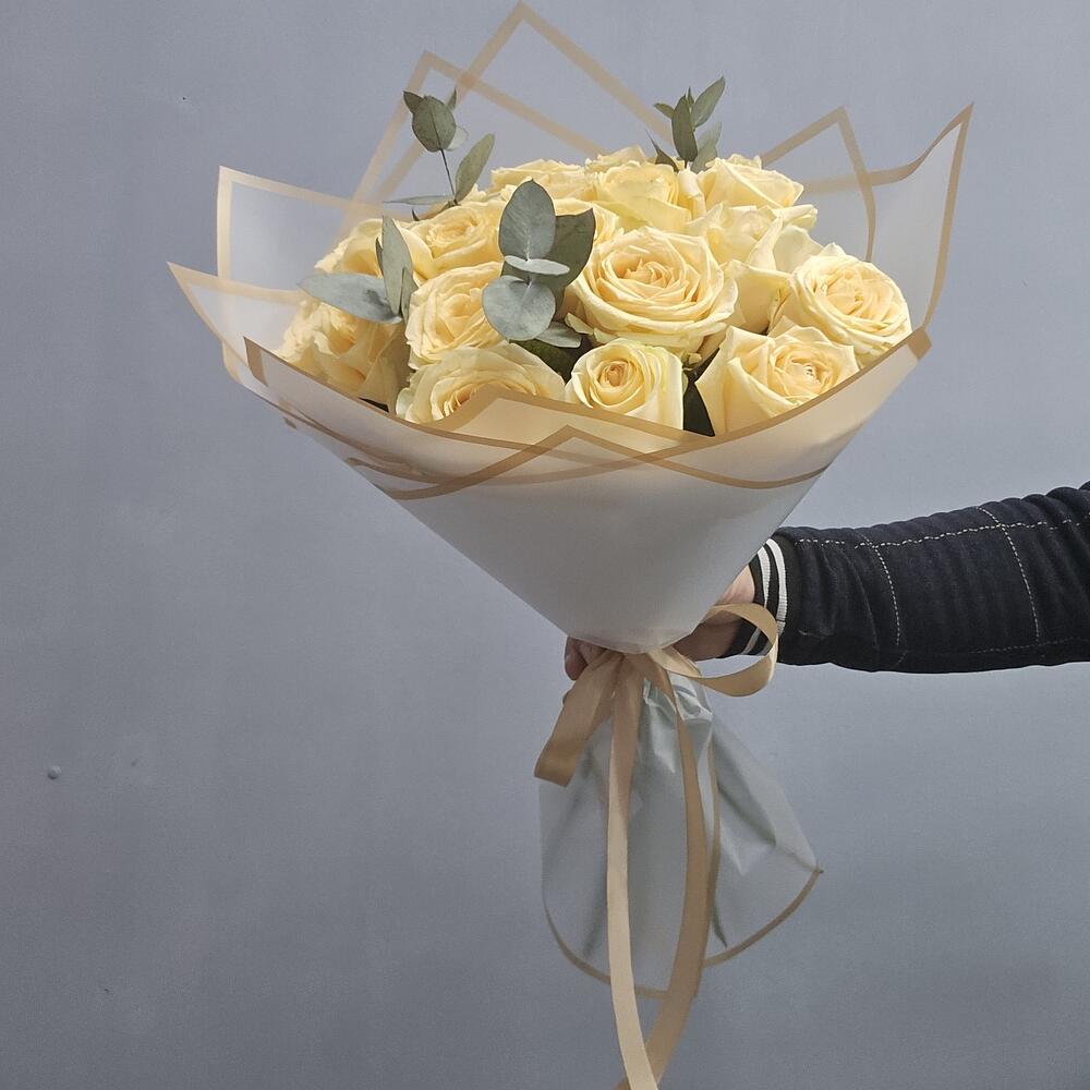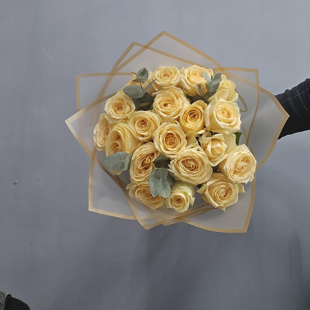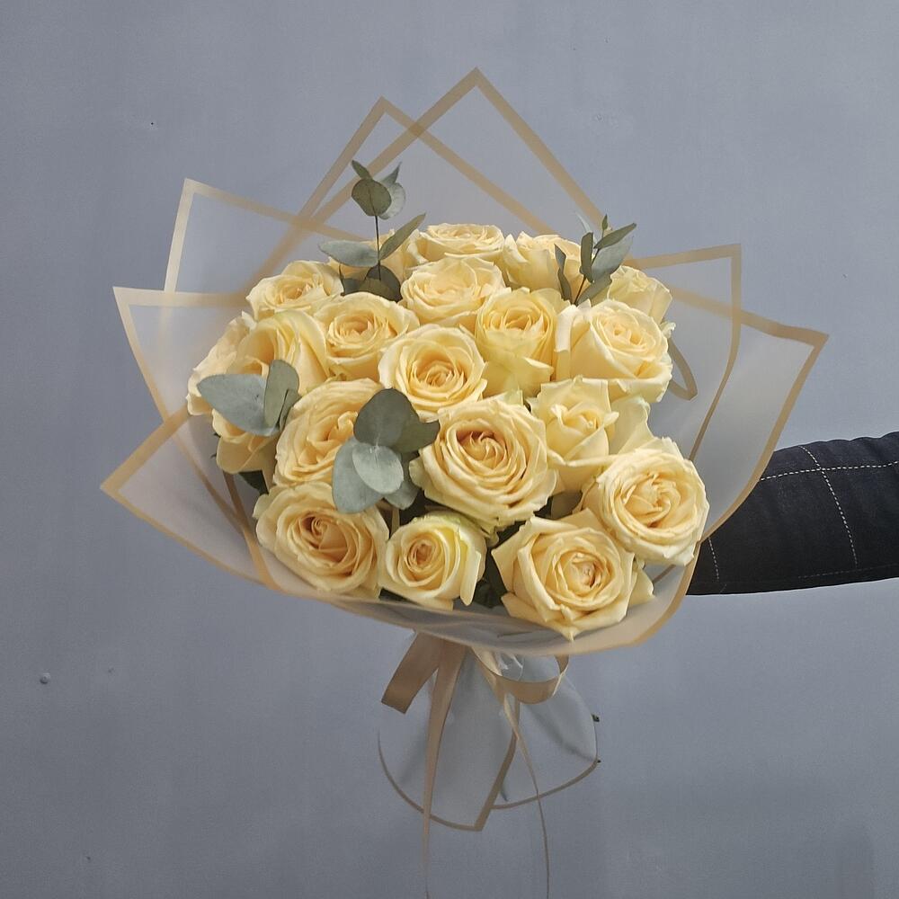 Eucalyptus - 4 pcs Атласная лента - 1 pcs Дизайнерская упаковка пленка - 5 pcs розы пич аваланж - 19 pcs