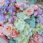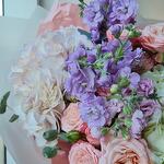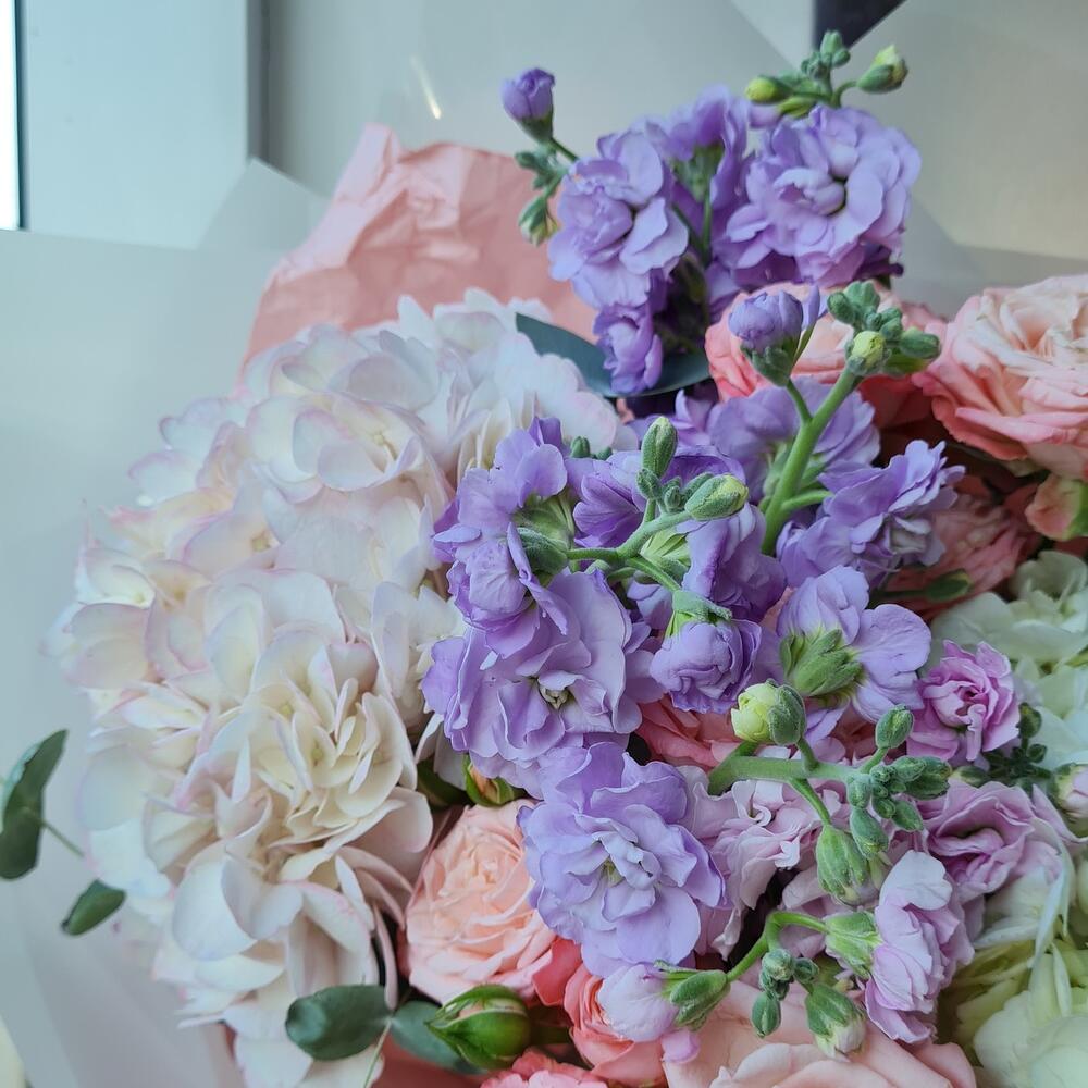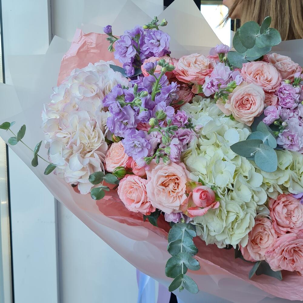 Hydrangea - 3 pcs Matthiola - 3 pcs The bush rose - 4 pcs Eucalyptus - 3 pcs The packaging is designer - 2 pcs