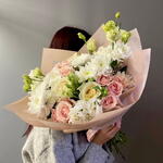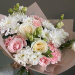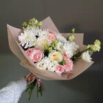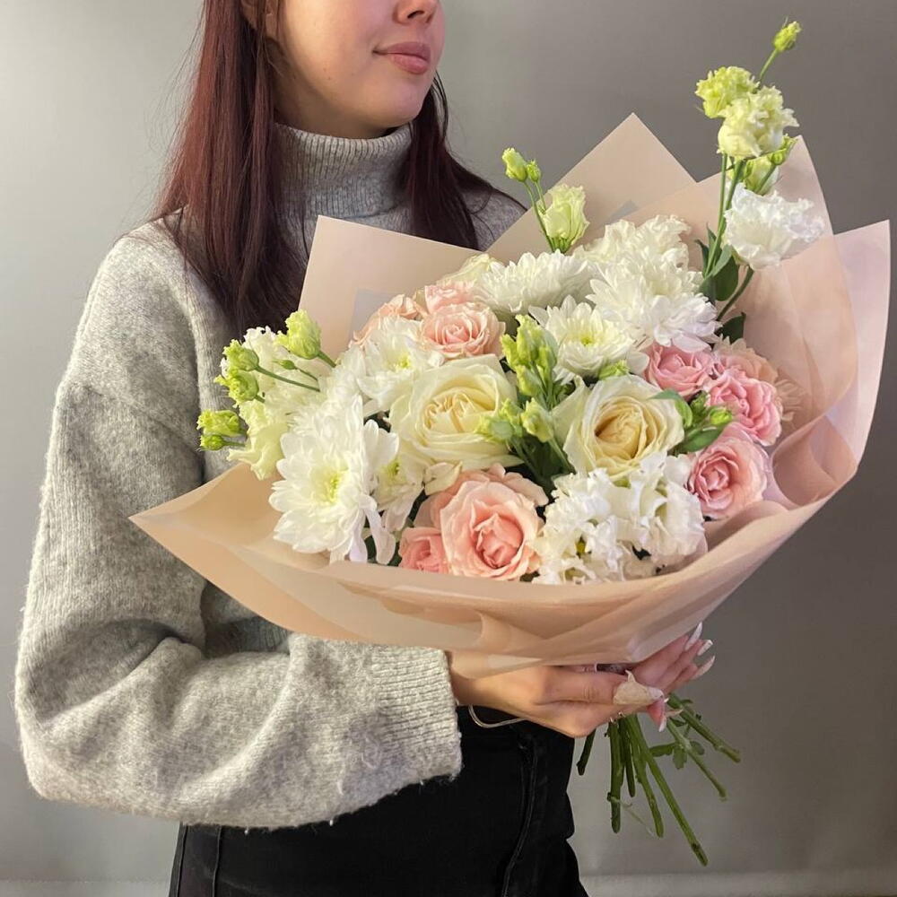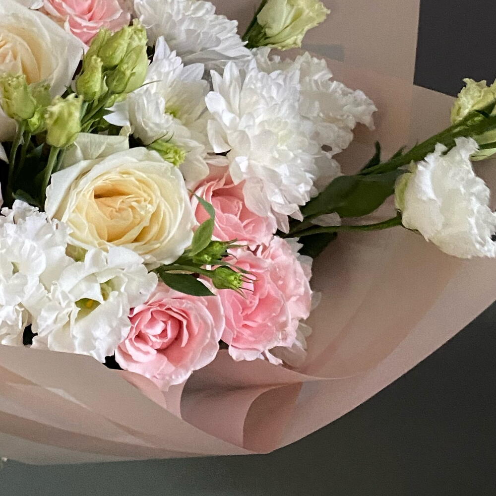 Букет из хризантемы, кустовая Роза, эустома. Нежный букет