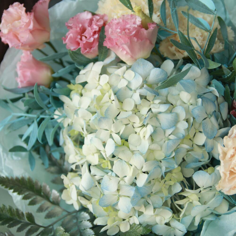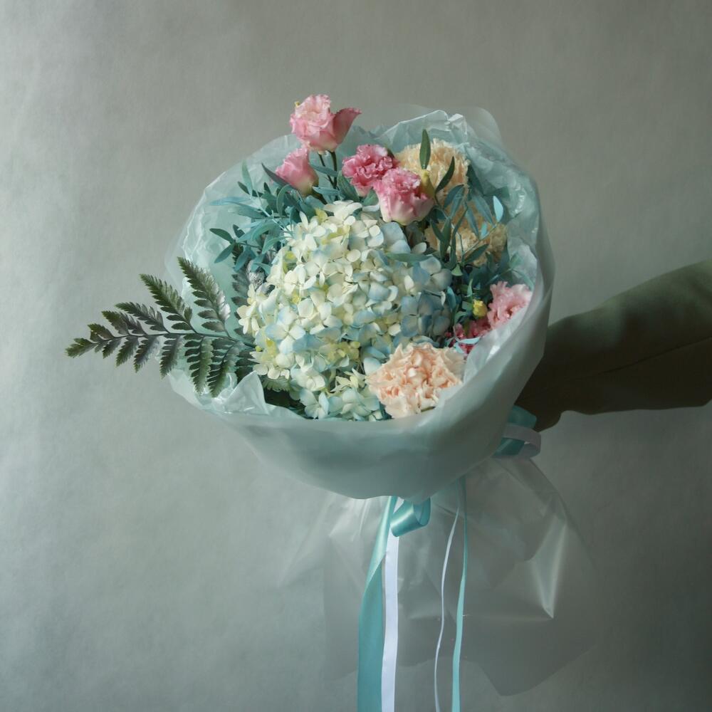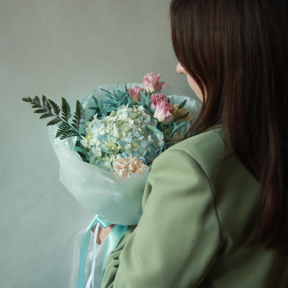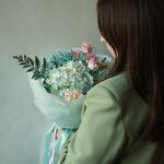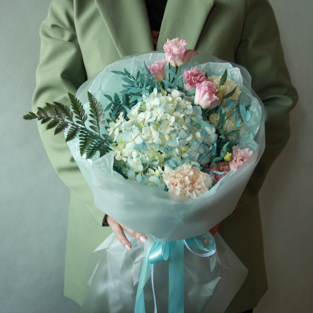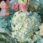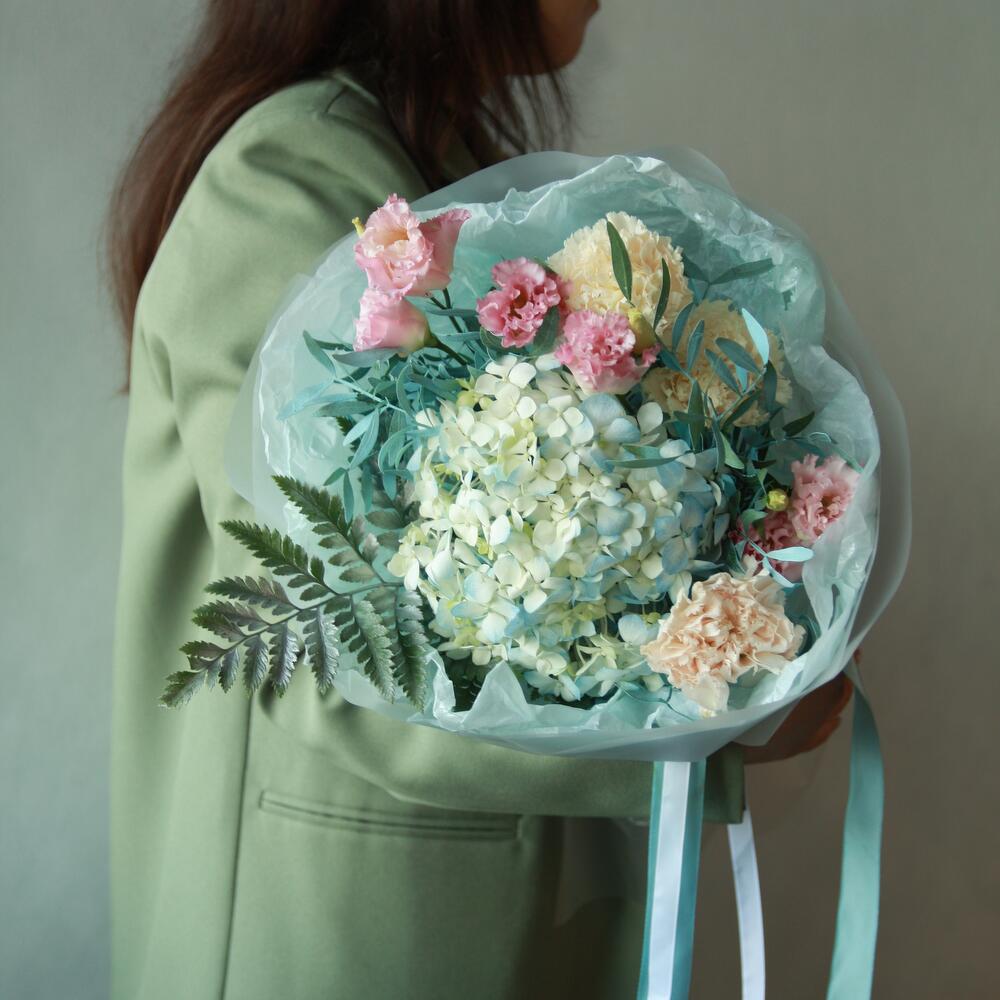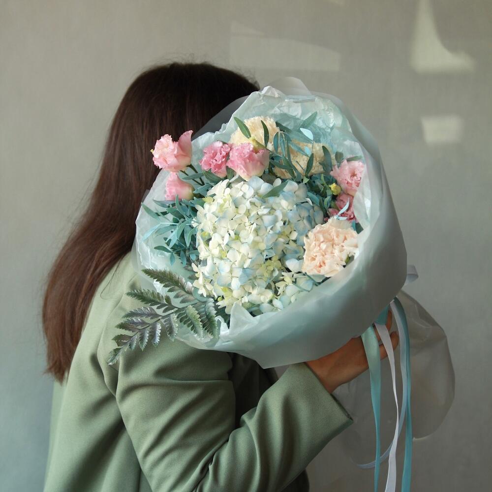 Hydrangea - 1 pcs Папоротник - 1 pcs Писташ - 3 pcs Eustoma - 1 pcs Диантус - 3 pcs упаковка авторская - 1 pcs