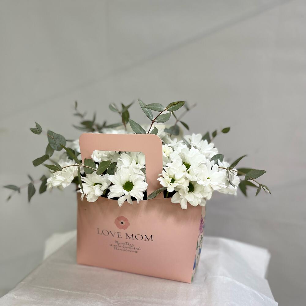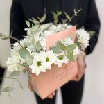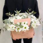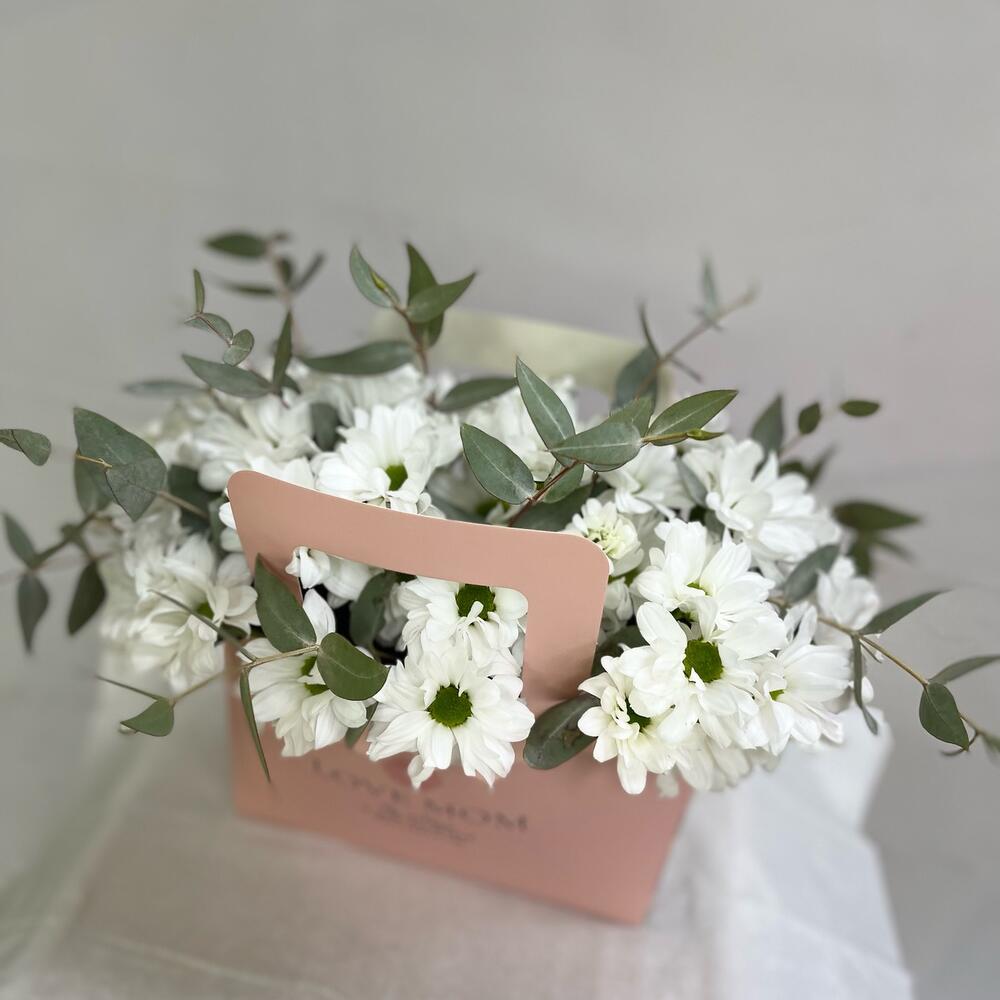 Пиафлор (оазис) - 1 pcs Chrysanthemum bush - 3 pcs Eucalyptus - 2 pcs Коробка - 1 pcs