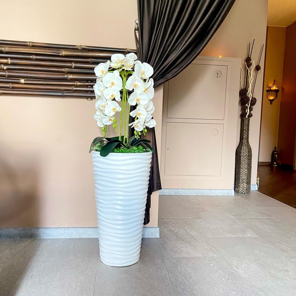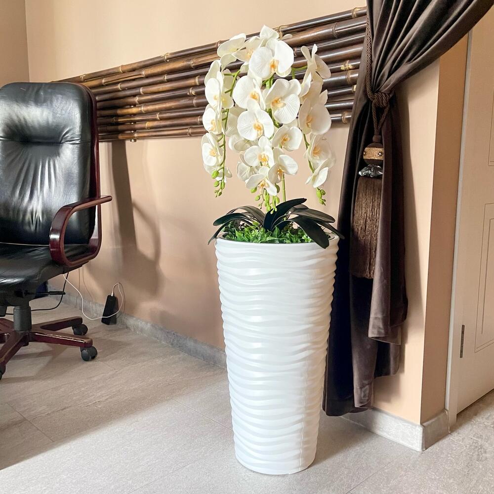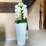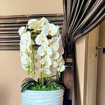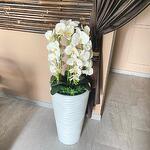 Эти орхидеи не завянут, они искусственные, но сделаны очень реалистично. Высоту цветов можно увеличит за счёт стеблей орхидей. Возможны варианты в других цветах: розовый, сиреневый, желтый. Если вы хотите другой цвет свяжитесь с нами.