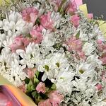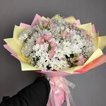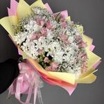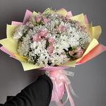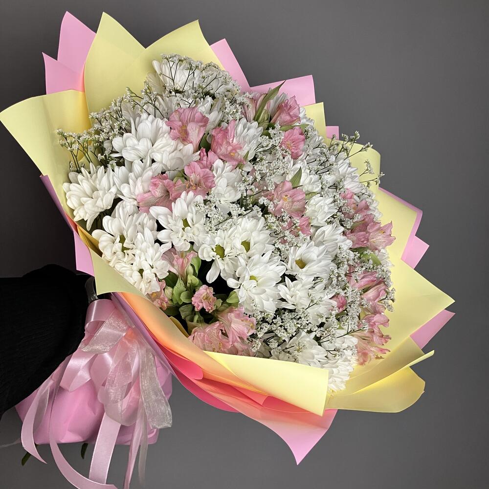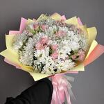 Alstroemeria - 6 pcs Лента - 5 pcs Chrysanthemum bush - 11 pcs The packaging is designer - 7 pcs Лимониум Белый - 7 pcs