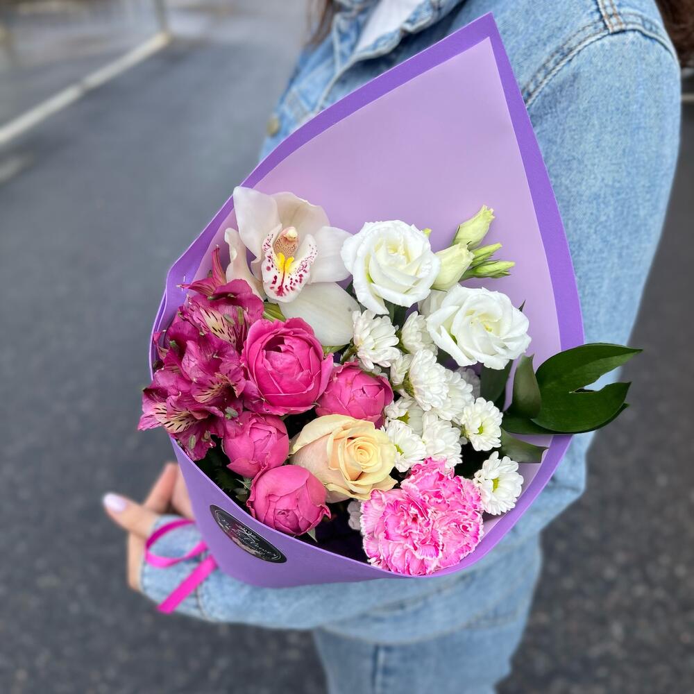Милый букет для любого повода. Экзотическая орхидея и пионовидная роза в составе композиции. Непромокаемая упаковка из фоамирана держит форму букета. Добавьте бесплатную открытку и мы донесем ваши слова до адресата. Каждый цветок в мире уникален и мы не можем гарантировать точную копию заказанной композиции, но Вы на 100% можете быть уверенными, что букет будет собран по указанному составу из свежих цветов, сохраняя стилистику и цветовую гамму. Перед доставкой каждый букет проходит контроль качества и мы отправляем фото, чтобы Вы могли убедиться, что Ваш заказ соответствует Вашим пожеланиям.
