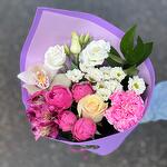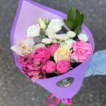 Alstroemeria - 1 pcs Орхидея Цимбидиум - 1 pcs Ruscus - 1 pcs Chrysanthemum bush - 1 pcs Rose - 1 pcs Eustoma - 1 pcs Диантус - 1 pcs Кустовая роза пионовидная - 1 pcs Дизайнерская упаковка - 2 pcs