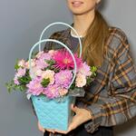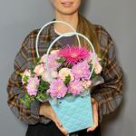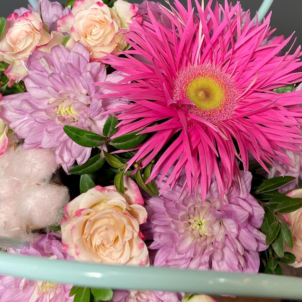 The bush rose - 1 pcs Gerbera - 1 pcs зелень фисташки - 1 pcs сухоцвет хлопок - 1 pcs хрищаентема кустовая - 2 pcs